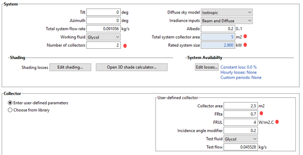 For example, this screenshot shows inputs for Collector Area = 2.5 m2, FRta = 0.7, FRUL = 4, and Number of Collectors = 2.