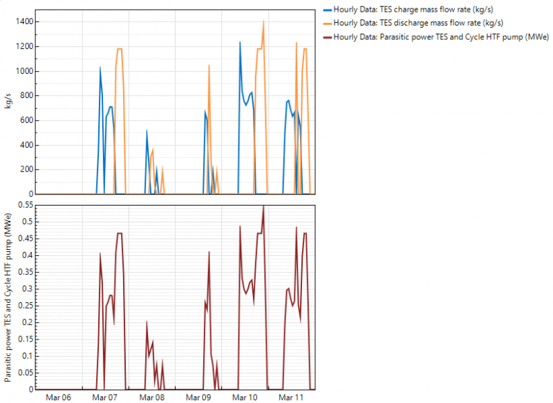 For my application, I am interested in the charge/discharge mass flow rates of the molten salt on the storage side of the said heat exchanger, as well as the associated pumping power. I just want to clarify whether SAM does report it as output variables for an indirect system, or whether I should calculate them externally.