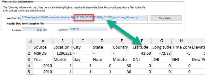 In the file name SAM constructs when you download a weather file, it puts the location name (or lat/lon pair you used for the request) at the beginning of the file name and the lat/lon of the grid cell at the end of the file name so you can see the difference.