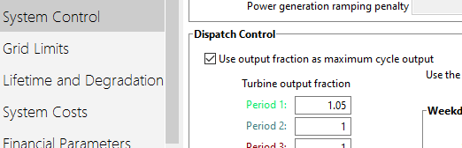 In versions of SAM up to 2018.11.11, SAM allows the power cycle to operate at the over design operation level even if it exceeds the dispatch output fraction. For SAM 2020 (available at the end of February), we have implemented a new option so you can choose to limit the power cycle output to the dispatch fraction: