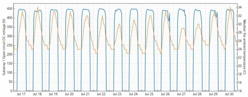 When you run a simulation, SAM calculates the system's performance parameters for each time step (hourly by default) over one year. Those parameters include the module operating voltage and temperature. You can see that information on the Results page, for example on the Time Series or Data Tables tabs.