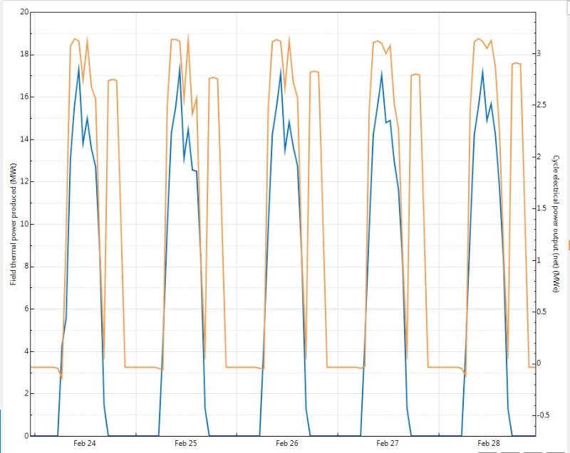 This is caused by the solar field and TES supplying HTF to the power cycle in parallel. At the end of the day, the field temperature slowly degrades until it hits some threshold at which the field turns “off” and begins recirculating the HTF. When it sends colder-than-design HTF (at a low mass flow rate) to the cycle, that stream mixes with hotter HTF from the TES. The combination is still somewhat colder than typical operation, and as such, cycle output decrease (see image below). In contrast, we model the tower as a steady state receiver that is either delivering HTF at (roughly) the design hot temperature or is off, so that model won’t show this problem.