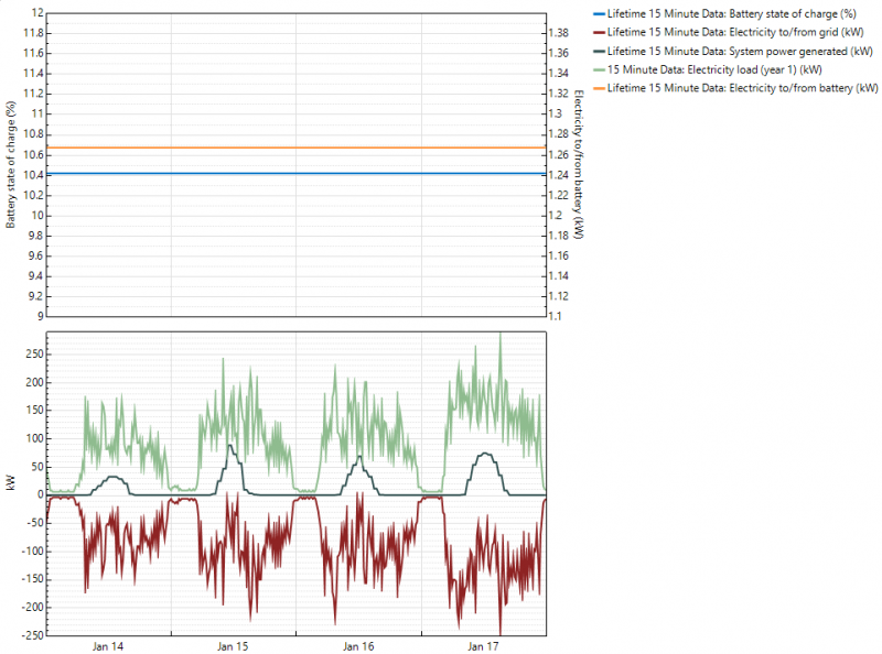 Same illustration but now with SAM Beta 2020.1.17, where the battery correctly delivers no power and the grid power equals the load power.