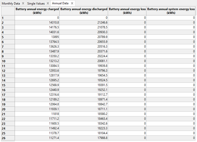 If we now look at the battery annual energy charged/discharged, we can observe a huge discrepancy between the charge and discharge energy (~7000kWh). This is certainly linked to the constant discharge power observed above.
