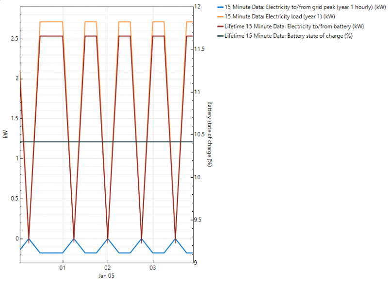 To illustrate my point, here is just an illustration of SAM 2018.11.11, with an empty battery and square pattern load profile. It can be seen that the "power" falsely delivered by the battery reduces the grid power.