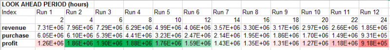 Not understanding why the crude manual dispatch gave better results, I returned to the automated dispatch running a parametric analysis with look-ahead period as the input and revenue, electricity_purchase as outputs. Results are shown below: a period of 6 hours gives the best outcome and from that point on any increase in the period gives a lower profit than the previous. The manual solution gave a profit of ~1.38E+06 (for reference).