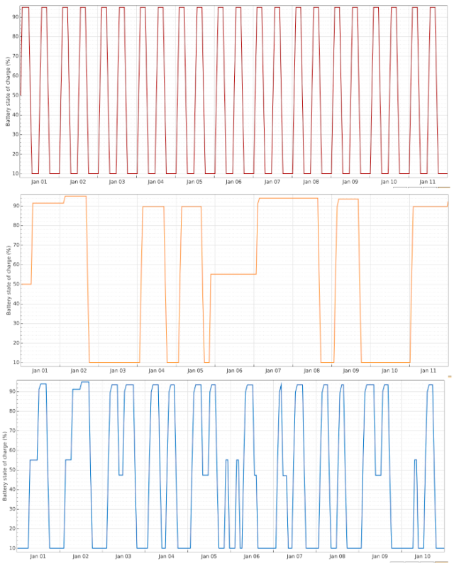 After Paul's suggestion, I include the SOC time-series for manual (red), auto24 (orange) and auto6 (blue) and attach the .sam file.