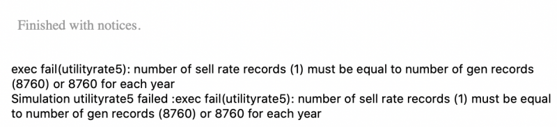 However, when trying to run a simulation, I get this error: "exec fail(utilityrate5): number of sell rate records (1) must be equal to number of gen records (8760) or 8760 for each yearSimulation utilityrate5 failed :exec fail(utilityrate5): number of sell rate records (1) must be equal to number of gen records (8760) or 8760 for each year"