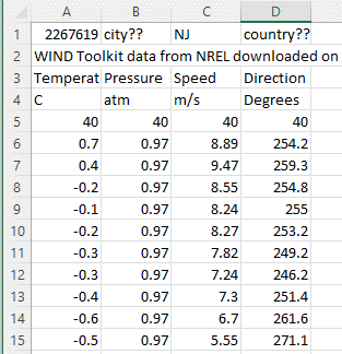 I'm viewing a downloaded wind data SRW file in Excel. My understanding is that these are the same data files from the NREL WIND Toolkit? The actual data look like this (see below). I am guessing that it's not coincidence that 8,760 rows of data works out to be the same number of data points as hourly data for 365 days would be? Can I assume that the first data point in row 6 is Jan 01 00:00 (12 something AM), the second is Jan 01 01:00 (1 something AM), etc. and the final data point is Dec 31 23:00 (11 something PM)?