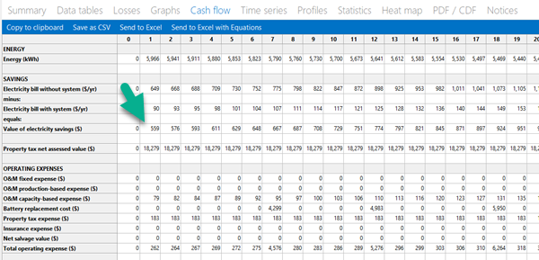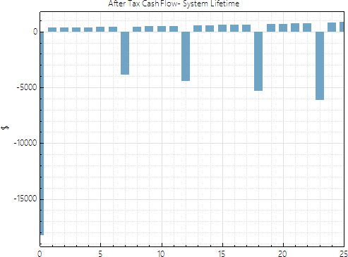 For example, in your "PV/Bat Condominio" case, the after-tax cash flow graph on the Summary page shows large expenses in Years 7, 12, etc. It also shows that the annual savings (positive) are very small compared to the Year 0 cost (negative), so even without those expenses, it is unlikely that this project will have a positive NPV.