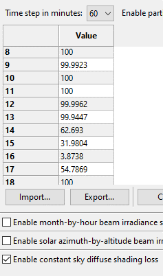 SAM version 2020.11.29. Trying to assess the relative impact of module placement on a roof where shading from other roof surfaces will be an issue. No issues with placing a one module active surface on a roof where there is no shading. Moving the active surface to a different roof section where some shading can be expected is a disaster. Suspect I'm missing something obvious. The 1st shot is the active surface at roof level while the 2nd shot simply changed the active surface Z value from 19.55 to 24.55 essentially clearing the surface from any shading. Z values are feet. Expectation was that the 1st shot would show some shading loss in hour 17. No idea how/why the 2nd shot shows a shading loss at hour 14.