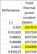 I'm doing some parametric runs with the CSP physical trough model for a plant similar to Andasol 1. I've noticed that when changing the SCAs' reflectance value (all else being equal) some of the parametric runs returned slightly different values for the yearly sum of the field thermal power incident variable.