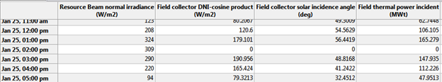January 25th is a low resource day, and that hour coincides with the hour that the HTF temperature reaches the design loop inlet temperature of 293 degrees. For the 0.935 case, I changed the design loop inlet temperature input on the System Design page to 290 degrees, and that field incident power value for 2 pm January 25 was not zero. That suggests to me that the controller is setting the input power to zero under some conditions that are marginal for power generation.