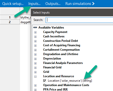 3. Choose Location (solar_resource) as an input variable: