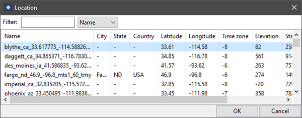 4. Click a cell row in the "solar_resource" column of the parametrics table, and choose the weather file from the solar resource library. This list of weather files is the same as the list you see on the Solar Resource page.