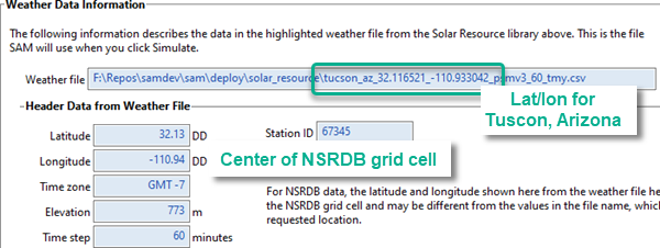 SAM displays the file name and latitude and longitude from the weather file on the Location and Resource page under "Weather Data Information." For example, this screenshot shows the result of a request I made using the location name "Tuscon, AZ:" The geocoding service returned the latitude/longitude pair 32.116521,-110.933042 that you can see in the file name. SAM then used that latitude and longitude to request data from the NSRDB, which returned a weather file for the grid cell centered 32.13,-110.94 that you can see under "Header Data from Weather File:"