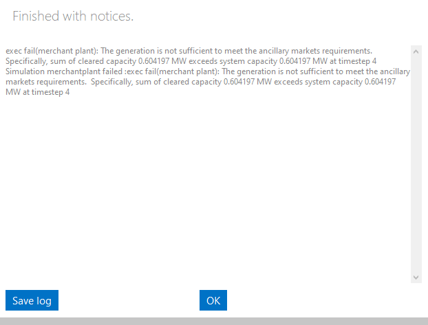 I'm running a Detailed PV-battery Merchant Plant simulation, where i was getting an error about "The generation is not sufficient to meet the ancillary markets requirements". So, i ran the same model in a ppa single owner simulation to get the dispatched output, and then uploaded that into the merchant model cleared capacity. However, the error continued, even with the numbers mention in the error being exactly the same (image attached).