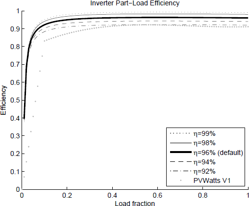 PVWatts uses the efficiency curve below (Figure 4 from the PVWatts Technical Manual ) to model the inverter so that the inverter is slightly more efficient at higher load fractions.