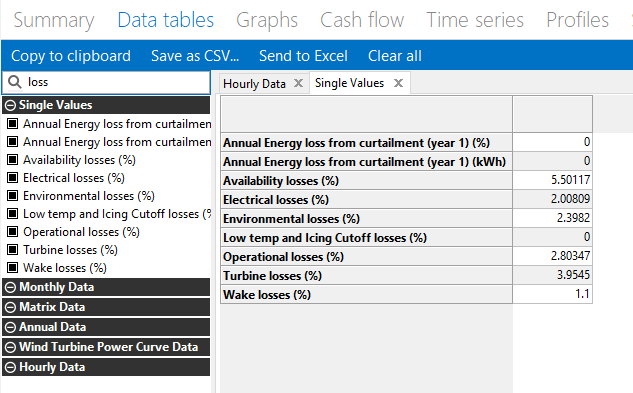 The sum of the various losses on the Losses input page is 16.7%, and there's an additional 1.1% loss from the wake model. You can display all of the loss values on the Data Tables tab of the Results page and export them to a spreadsheet: