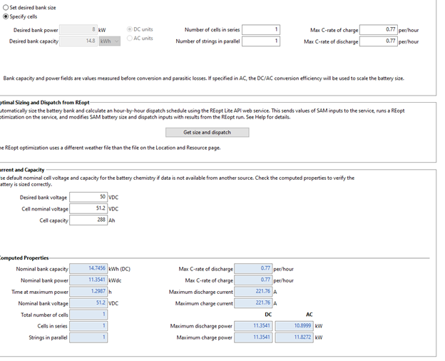 I am trying to model a residential hybrid PV system in SAM and am just struggling to get the battery part of the simulation to give the results I expect. I am modeling a 15kW system with a 14.8 kWh 48V LiPO4 battery. When I input 14.8 kWh as my battery size, it seems to me that the battery is actually way below this capacity and charges/discharges far quicker than it should and as a result the battery hardly gets used at night. I was just messing around and instead used a battery capacity of 1474 kWh and that gives me results more in line with what I expect. I have attached my project file to reference, any help would be appreciated.