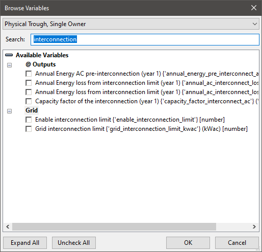 One way to find the names of these variables is to find them in SAM's user interface, and then use the LK script editor to list the variables: On the File menu, click New script, and then in the script editor, click Variables at the top of the window. You can then search variables by their labels to find the variable name.
