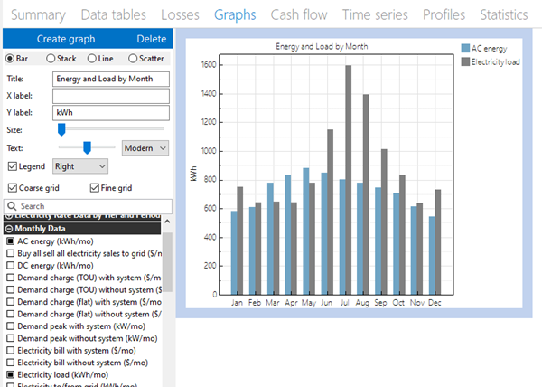SAM's graphing capabilities are limited, so if you want more control over graphs, you can export data to a spreadsheet program or other graphing program. You can export data from any graph in SAM by right-clicking the graph, or from the Data Tables tab.