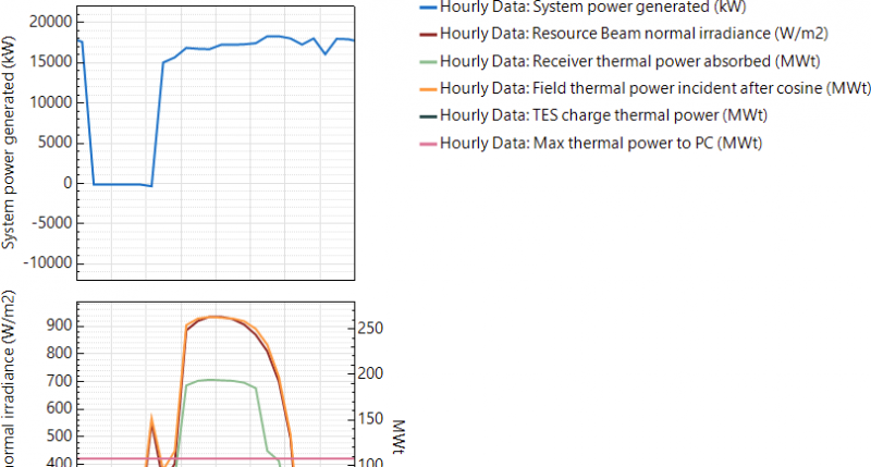 Hello PaulI'm designing a CSP with a nominal power of 35MW. The solar multiple is 1.8 and the Design point DNI of 900 W/M^2. When I simulate i see that the power output never reaches the nominal capacity of the plant but i don't know why. The DNI in the summer solstice is far enought (950W/m^2) and even the thermal power absorbed in the collector is the nominal that SAM has calculated but the power generated neer reaches the 35MW stays in 20MW.Attached graph and the SAM file. Regards Rubén.