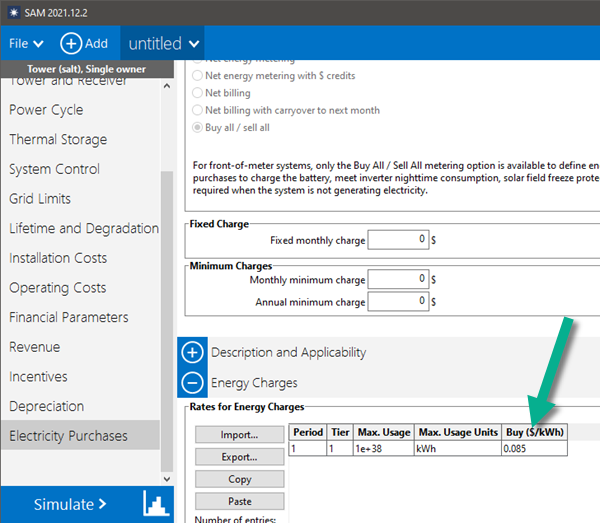 3. Under Energy Charges, set the Buy rate to the electricity purchase price. You can set this price to a retail rate, or to an estimate of the PPA price. After running a simulation to calculate the PPA price based on the target IRR, you can change the buy rate to the calculated PPA price and run another simulation to generate the final cash flow.