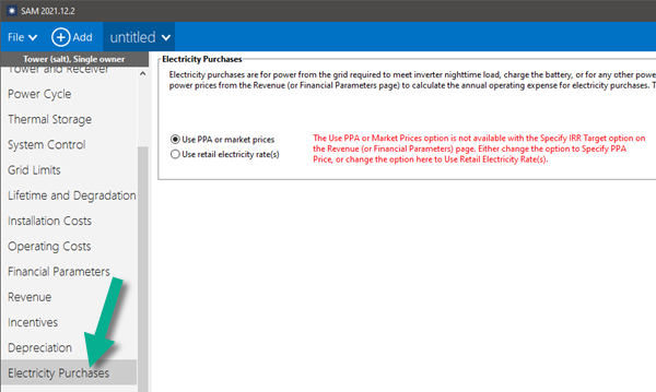 The Specify IRR Target option requires that you specify the purchase price of electricity for freeze protection and other night-time parasitic loads on the Electricity Purchases input page instead of using the PPA price for the purchase price. This is because for the Specify IRR Target option, SAM does not know the PPA price at the beginning of the simulation, so it cannot calculate the cost of electricity purchases unless you set the purchase price.