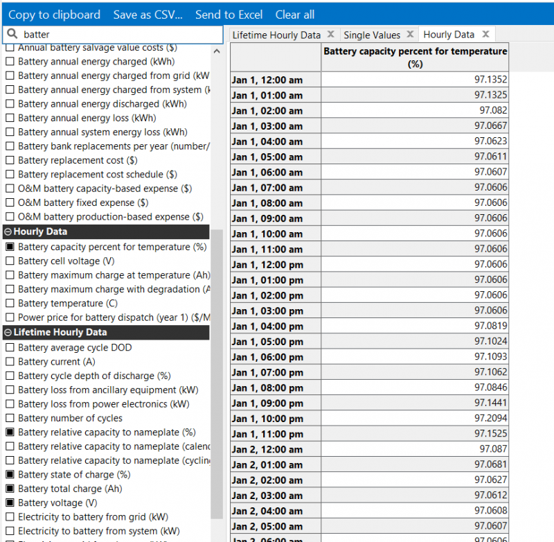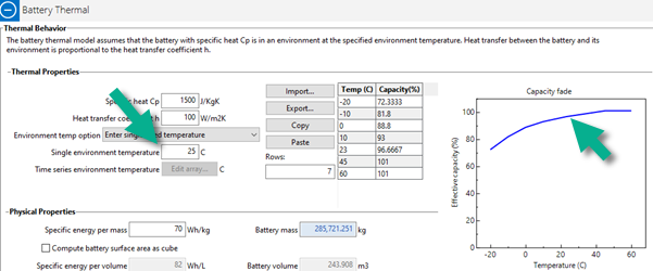In the time series results, you can show the Battery capacity percent for temperature variable to see that effect in the results: