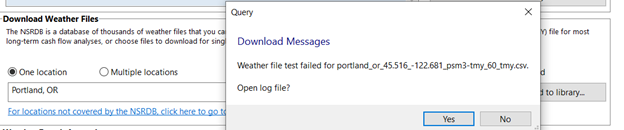 I am having the same problem as Donald. My log file looks the same: "weather test file failed for....". I had this problem with my 2020 version too, but prior to that, downloading weather files from the "Location and Resource" page was easy and worked every time. I have attached a "bad" text file that I received when going through this process today for Portland, OR.