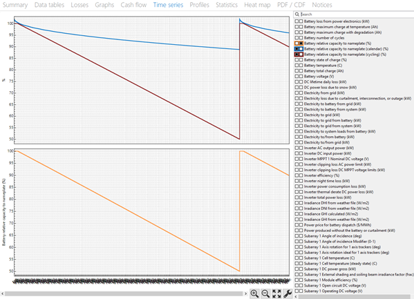 To see the effect of battery degradation over the project life, plot the battery capacity variables on the Time Series tab, and zoom out all the way to see the entire lifetime. This example shows the effect of battery replacement on its capacity, and you can see that battery cycling dominates calendar degradation:
