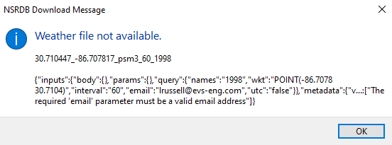 For solar models, a workaround is to download files directly from the NREL National Solar Radiation Database (NSRDB) website. Here is a short video demonstrating how to do that:
