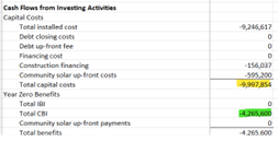 The IBI and CBI appear in both the "Investing Activities" and "Financing Activities" to record their effect on those parts of the project cash flow. Under Investing Activities, the incentives are subtracted from the total installed and other initial costs to calculate the purchase of property. Under Financing Activities, the incentives are added to the issuance of equity. Because the pre-tax cash flow is the sum of operating, investing, and financing activity cash flows, the net effect is that these incentives are a benefit in Year zero of the pre-tax cash flow.