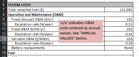 In the Excel file, at "System costs" / "Operation and Maintenance Costs" (line 8 and below), I see only the PV costs, and not also the Battery O&M costs. I have compared also the SAM result and the Excel result and the LCOE results are different.