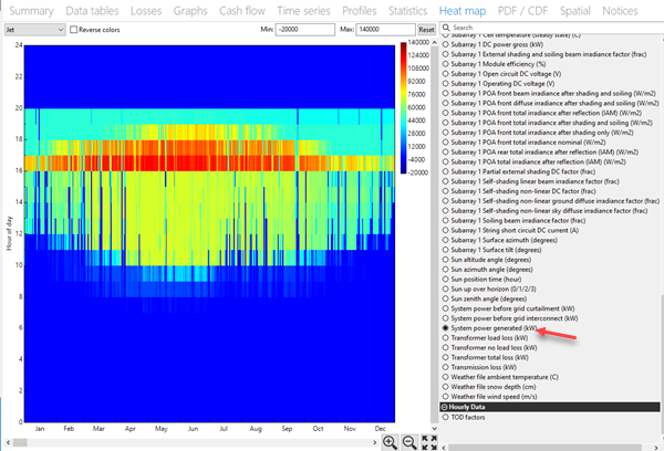 I built a model in SAM consisting of PV and battery systems, ran it for 25 years and got results for minimizing the electricity costs and prioritising the cheapest energy source. Now my question is that what the information the colours of heat map give? Thanks in advance