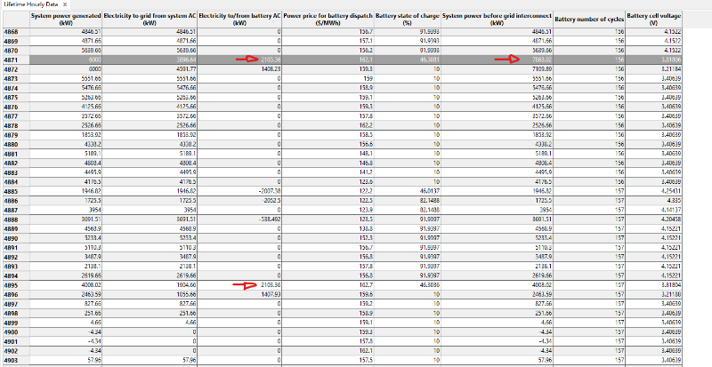 When I analyze the results, I realize that during moments of high prices, if the production from PV+Wind is, for example, 5764.66 kW, I only need the battery to provide me with 235.34 kW. However, it provides 2103.36 kW continuously. I don't understand why it keeps discharging 2103.36 kW repeatedly.