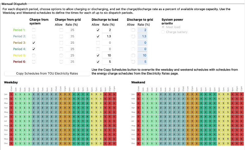 Really have enjoyed modeling with SAM!But perplexed by this one...and guessing I have incorrect settings. Am using a Net Billing model.Trying to model the battery discharging to meet load demands after solar availability, and avoid grid. Using an 18.5 kWh, 360AH battery. Have set TOU settings. See attached. Yet my "Energy to Load from Battery" Data is showing about 20kWh per month, when I'm expecting to see about 150 to 300 kWh per month (about 5 to 10 kWh per night). My actual results show an average of about 7kWh per evening over the past several day. Will really appreciate your guidance! Thanks!