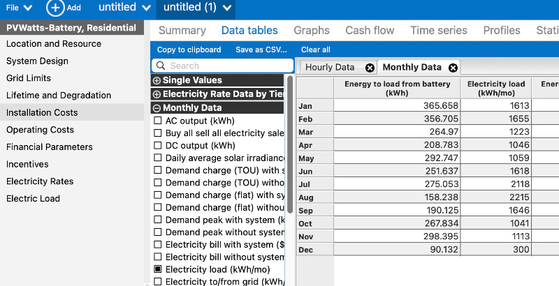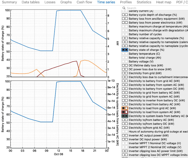 Another clue...Here's the data which shows about what I'd expect. The difference is that this is from running a quick model using PVWatts-Battery, Residential versus PV-Battery, Residential. Hmmm....