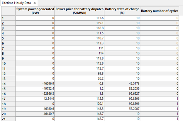 For the front-of-meter automated dispatch, SAM attempts to charge the battery when the price of electricity is low, and discharge when it is high, taking into account the battery state of charge, and maintaining battery health to minimize battery replacement costs. The following outputs from your file show this behavior: