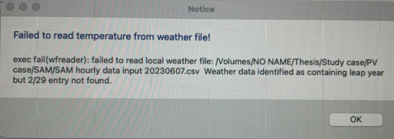 I have created a weather file following SAM instructions. But when I uploaded to SAM it displays this message . 2021 is not a lap year, I do not understand this message and also I cannot find any issue with the temperature. Here I attache the csv file , up you can help me to identify what is wrong.
