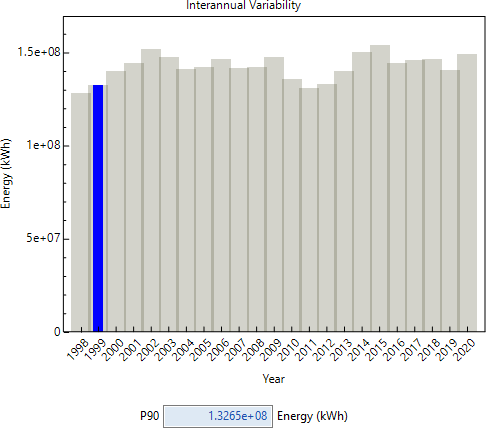 4. Yes, the new Uncertainty simulations replace the old P50/P90 ones for the Detailed PV and PVWatts models. The new feature shows you the year that represents the PXX value, so you can run a "regular" simulation by choosing the weather file for that year on the Location and Resource page and clicking Simulate. For example, this graph shows that the 1999 weather file generates the P90 annual energy value, so you could run a simulation with the 1999 weather file to see the daily profiles and other results.