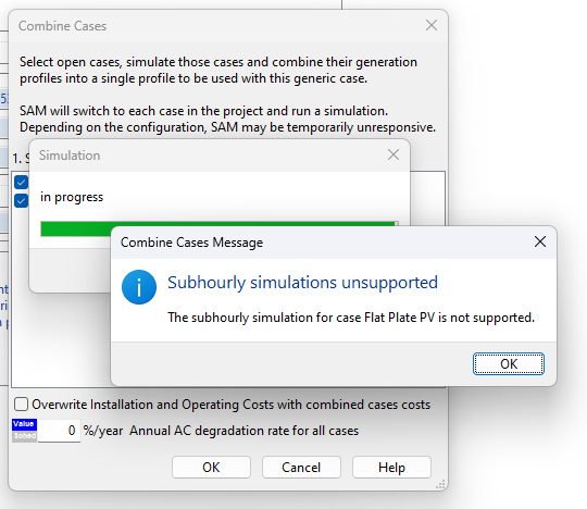 I am attempting to combine relatively large wind generation profiles (>500 MW capacity) with solar generation profiles with the use of the generic system model combine cases module. The "Calculate generation profiles and nameplate capacity from open cases" function works as intended until the wind generation capacity exceeds ~400 MW. Once this power capacity is exceeded, the "Calculate generation profiles and nameplate capacity from open cases" function returns the error "The subhourly simulation for case Wind Power is not supported". This is strange because the function works correctly for lower wind generation capacity (all other inputs are the same), and both the wind and solar individual cases are only setup to run hourly (60 min) simulations. Furthermore, these individual cases simulate without any errors or warnings. Therefore, I do not understand why the combined cases module cannot simulate.
