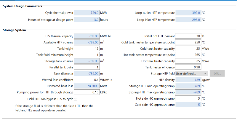 I have made a .CSV file containing the data for HELISOL@5A & XLP, and I've used it in my initial simulation without a storage system, but when I try to use the user-defined HTF in the thermal storage section, it basically gives me an error in the parameters.