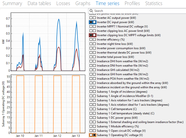 You can see the effect of inverter clipping in the results by displaying the following variables in the tables on the Data Tables tab or plotting them on the Time Series tab: