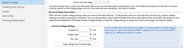 If you want to remove the effect of inverter voltage clipping, you can set Vmppt_high on the System Design page to a value higher than the array's maximum operating voltage. To avoid inverter power limiting, you can choose an inverter with a higher power rating.