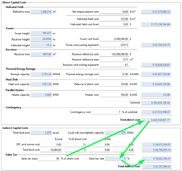 I am modeling a solar thermal molten salt system (IPH Tower Molten Salt, no Financial) to provide high-temperature heat (around 1000 degrees C) for a chemical reaction. Do I have to keep the sales tax at 5% for this analysis?- this solar thermal system is part of an integrated facility (solar thermal + chemical reaction system), so I am not selling power but providing heat to another unit in my integrated facility (assuming the 5% sales tax value is what the producer has to pay for selling power produced from their system).
