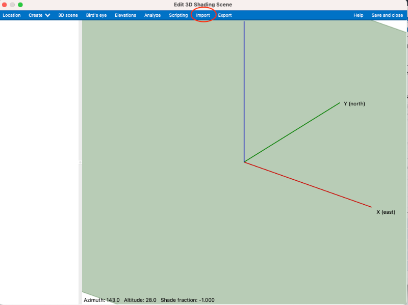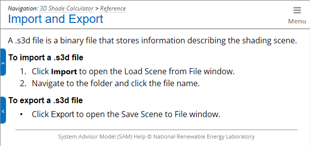 SAM's 3D Shade Calculator does not automatically import data from CAD software. The Import and Export buttons export files in the special .s3d format so you can save your shade scenes. From the calculator's Help system: