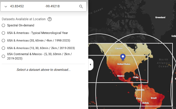 The location 43.83452,-99.49218 is in the U.S., so is covered by GOES V4.0.0, which is labelled on the map as "USA & Americas (30, 60min / 4 km / 1998-2023)":