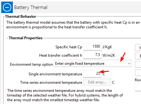 Please try setting the environment temperature option on the Battery Cell and System page (under "Battery Thermal") to Enter single fixed temperature, and then set the single environment temperature to the expected average ambient temperature of the air surrounding the battery. Alternatively, you can choose Enter time series temperature and then import time series (hourly) environment temperature set to 0°C. Your file uses the time series option with ambient temperature set to zero for all hours, which causes the battery temperature to be low.